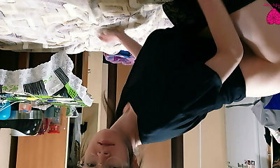 Girl without Underwear in T-shirt and Stockings Wished Sex