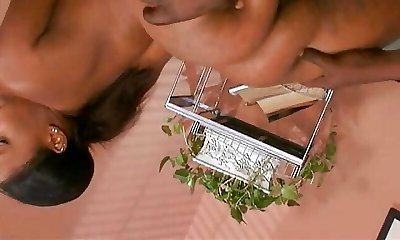 Red-hot ebony girlfriend plumbs white sugardaddy with her high heels on