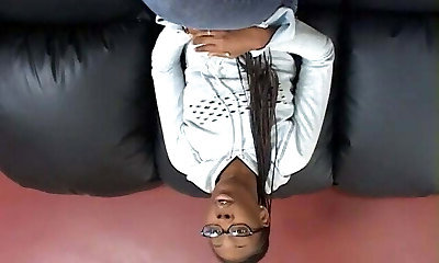 Sexy ebony in a tight bustier tastes white boner on the couch